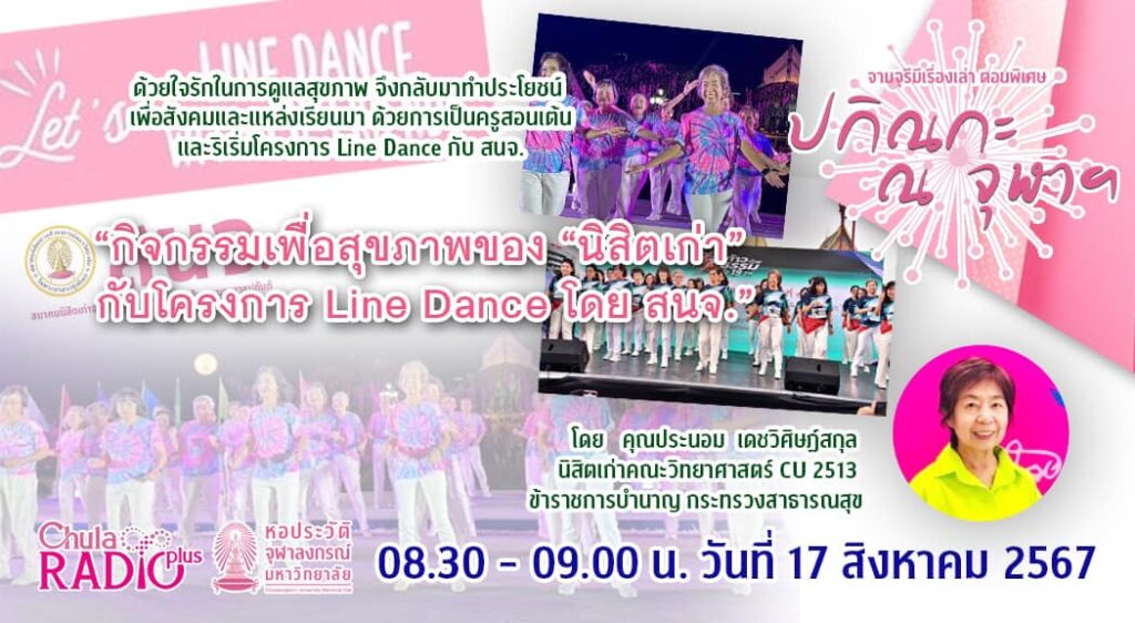 ชวนรับฟังการสัมภาษณ์ในรายการจามจุรีมีเรื่องเล่า ตอนพิเศษ ปกิณกะ ณ จุฬาฯ เรื่อง กิจกรรมหลังวัยเกษียณเพื่อสุขภาพและความบันเทิง ของ “นิสิตเก่า” กับโครงการ Line Dance โดยสมาคมนิสิตเก่าจุฬาฯ