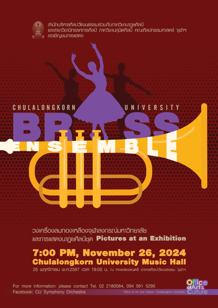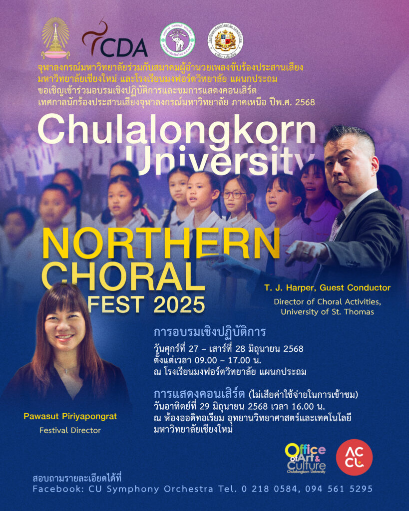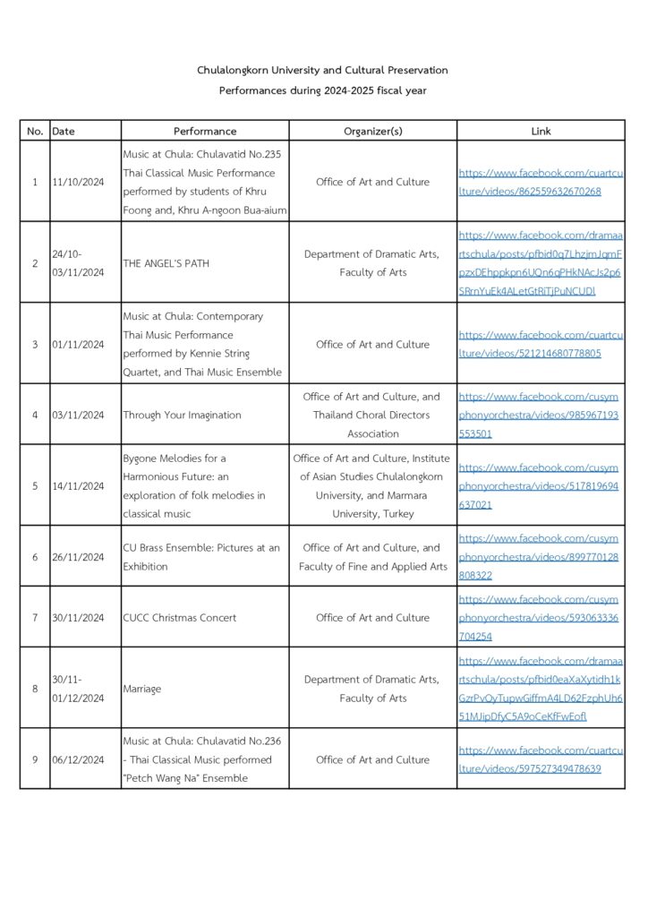 4. โครงการเผยแพร่ดนตรีและนาฏศิลป์ไทยในต่างประเทศ ในนามวงมหาดุริยางค์ไทยเยาวชนแห่งจุฬาฯ วง “ChulaThaiYO” นำนิสิตและคณาจารย์ไปแสดงดนตรีและนาฏศิลป์ไทย (1) งาน 25th Thai Festival Tokyo ประเทศญี่ปุ่น ซึ่งเป็นงานเทศกาลไทยที่ใหญ่ที่สุดในต่างประเทศ และมีผู้เข้าร่วมงานกว่าสองแสนคน (2) จัดการแสดงนาฏศิลป์ไทยชุด “เจ้าพระยา” ในงาน The 16th CUPT-CRISU Conference งานประชุมสัมมนาระหว่างที่ประชุมอธิการบดีแห่งประเทศไทยและประเทศอินโดนีเซีย ณ นครนูซันตารา เมืองหลวงใหม่แห่งสาธารณรัฐอินโดนีเซีย (3) แสดงในงานฉลอง 60 ปี ความสัมพันธ์ไทย–เปรู ณ โรงละครเทศบาลกรุงลิมา (Teatro Municipal de Lima) โรงละครเก่าแก่และทรงเกียรติที่สุดแห่งหนึ่งของสาธารณรัฐเปรู และโบราณสถาน Huaca Pucllana เขต Miraflores กรุงลิมา ซึ่งเป็นแหล่งโบราณคดีสำคัญอายุเก่าแก่กว่า 1,500 ปี