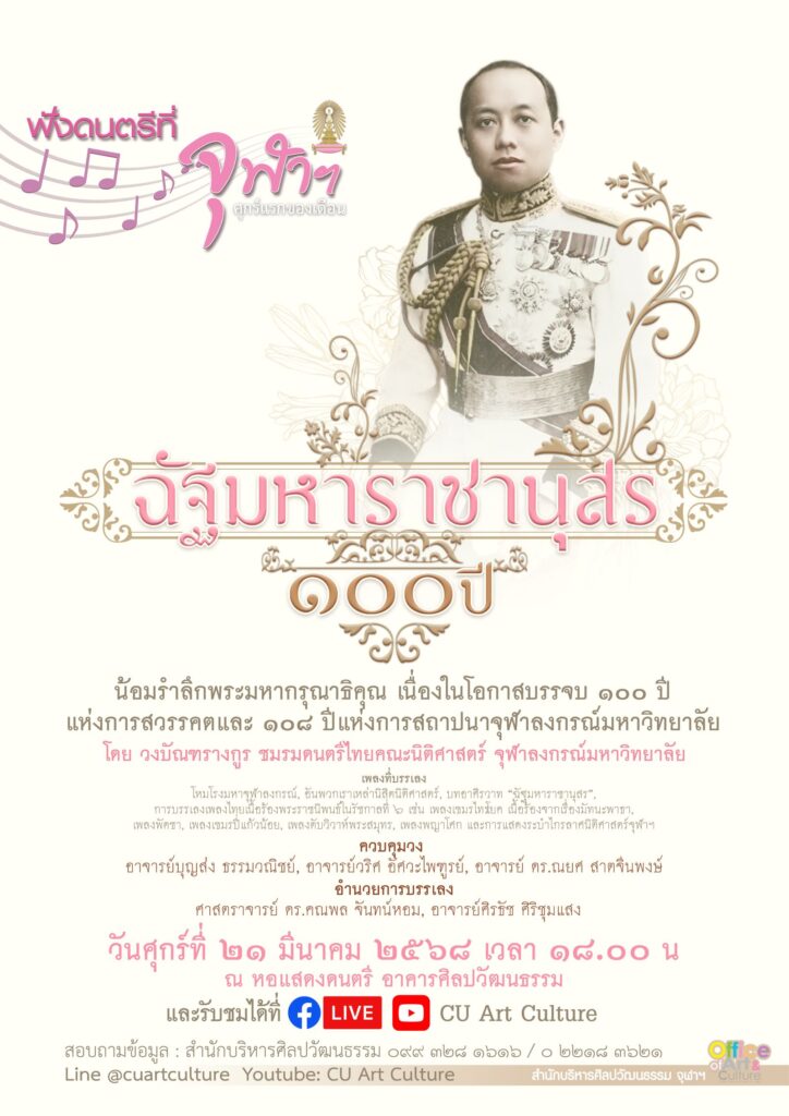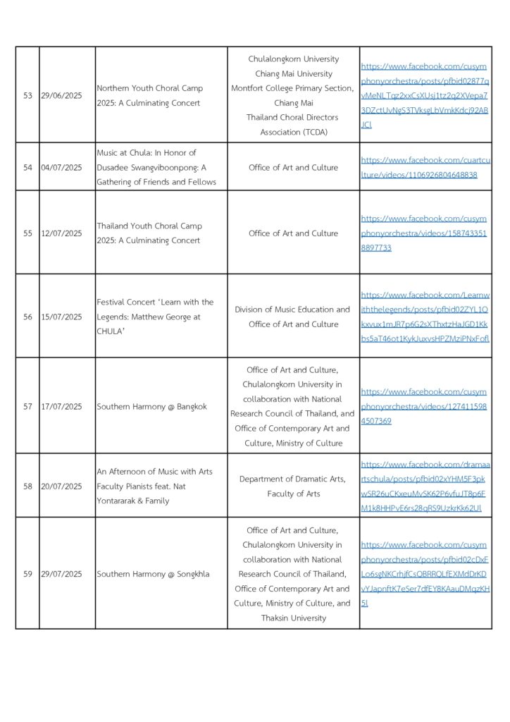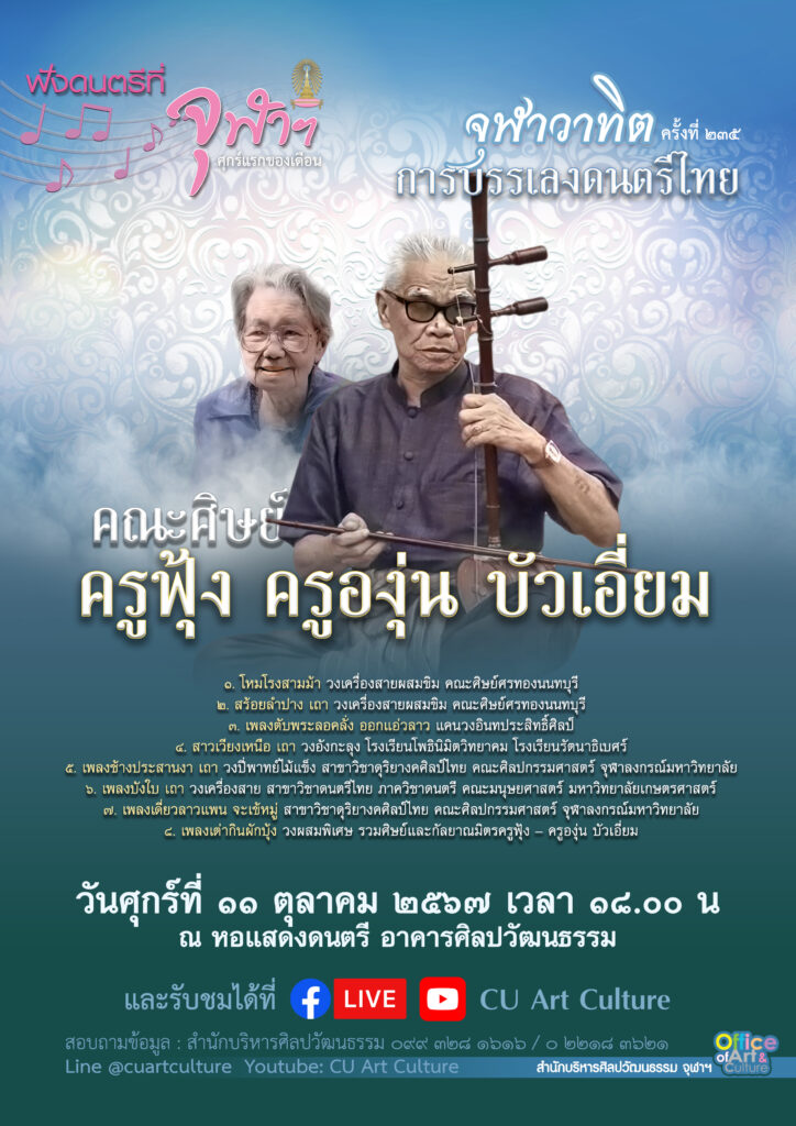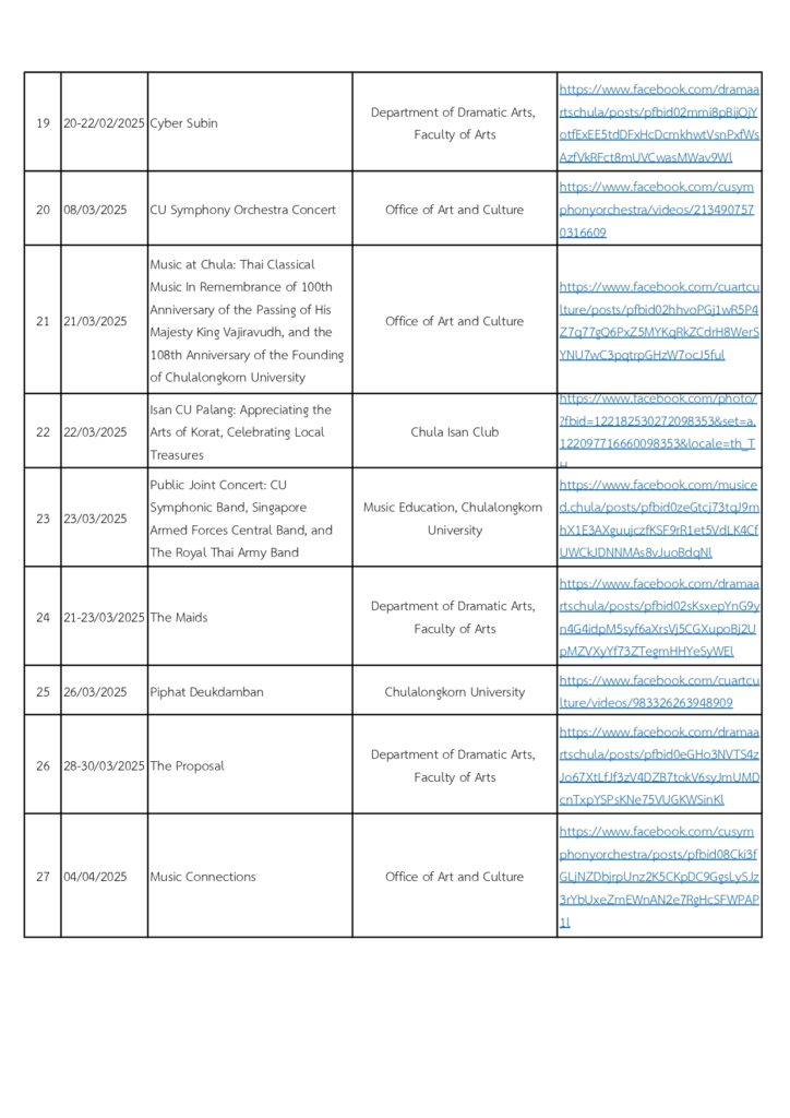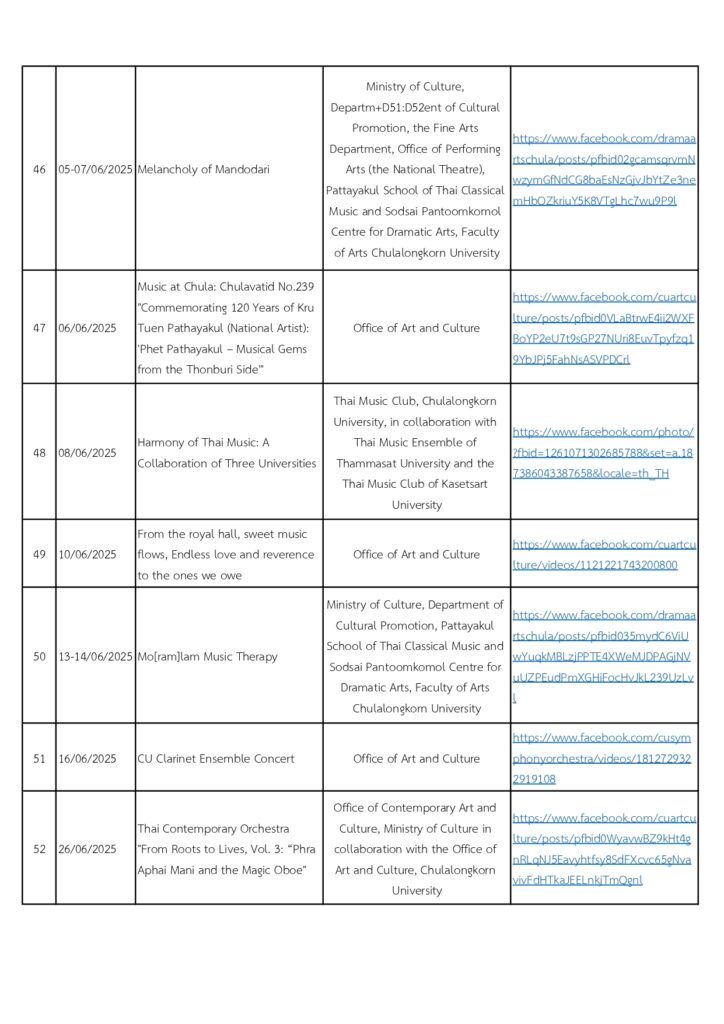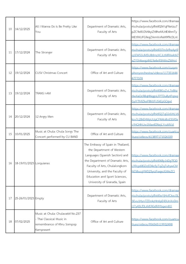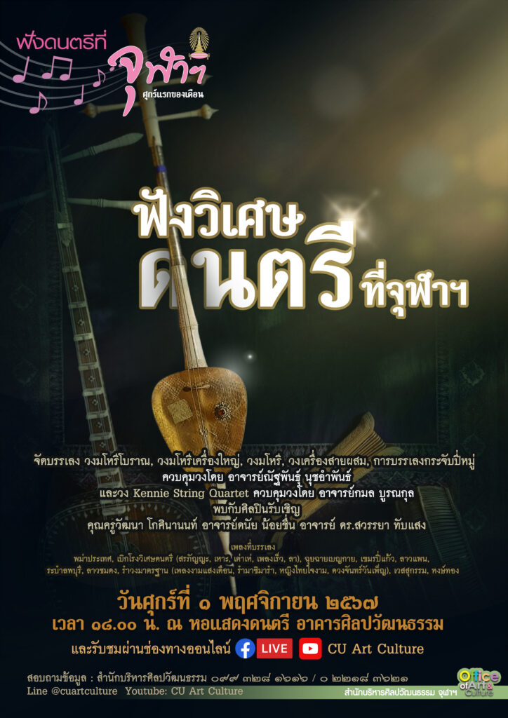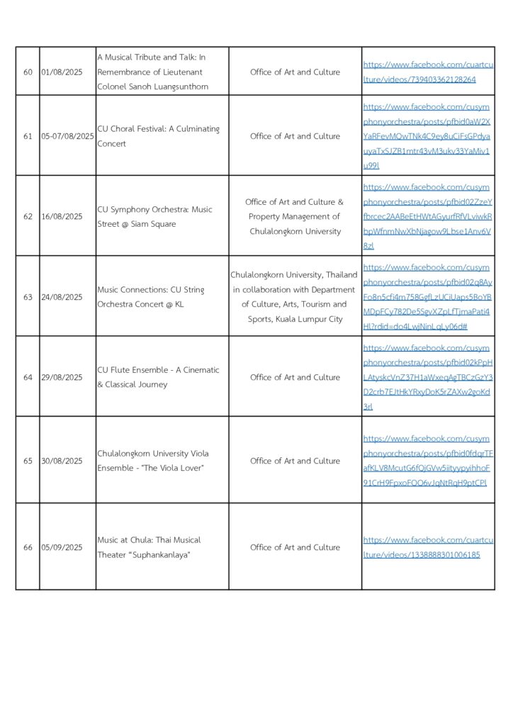 3. รายการฟังดนตรีที่จุฬาฯ ทุกศุกร์แรกของเดือน ปีละ 12 ครั้ง จัดการแสดงต่อเนื่องมากว่า 30 ปี โดยแบ่งเป็นการแสดงของวงดนตรีไทย 6 ครั้ง และวงดนตรีร่วมสมัยหรือไทยประยุกต์ อีก 6 ครั้ง