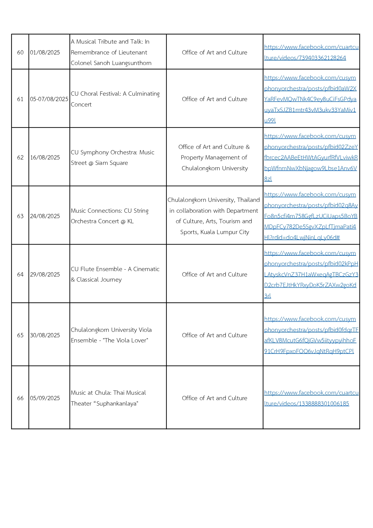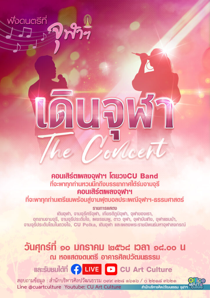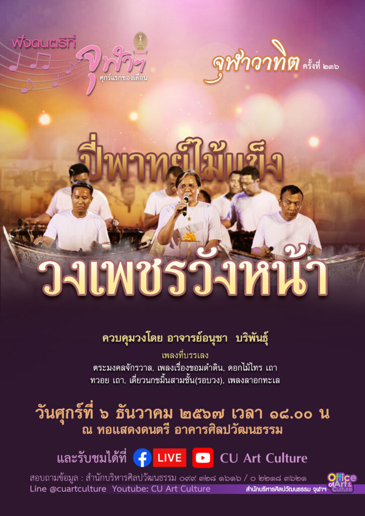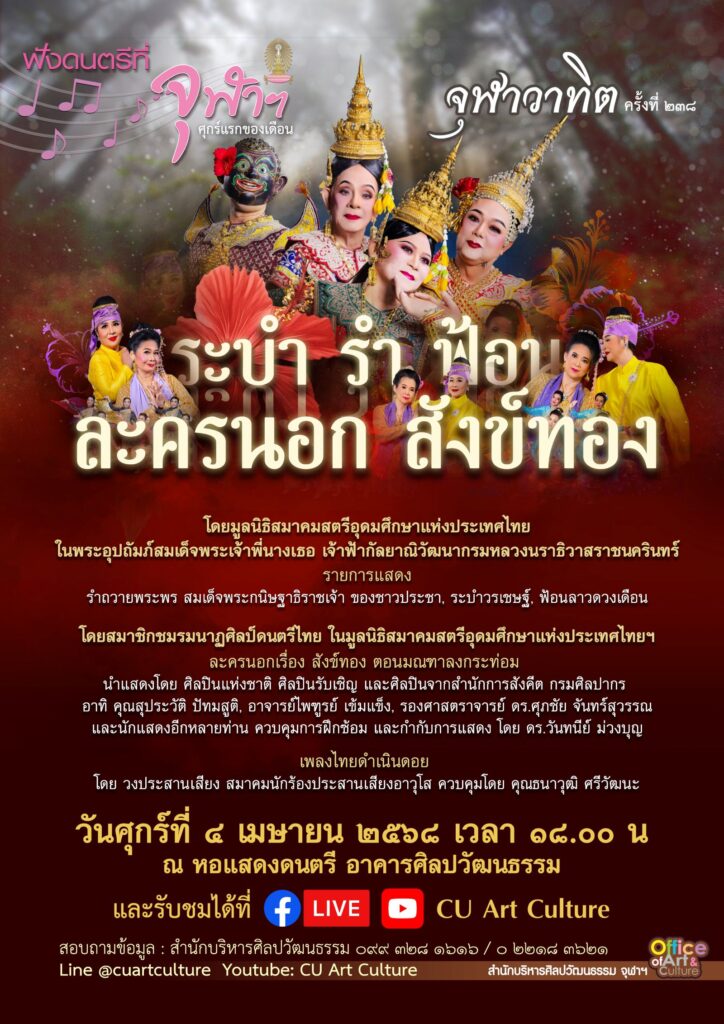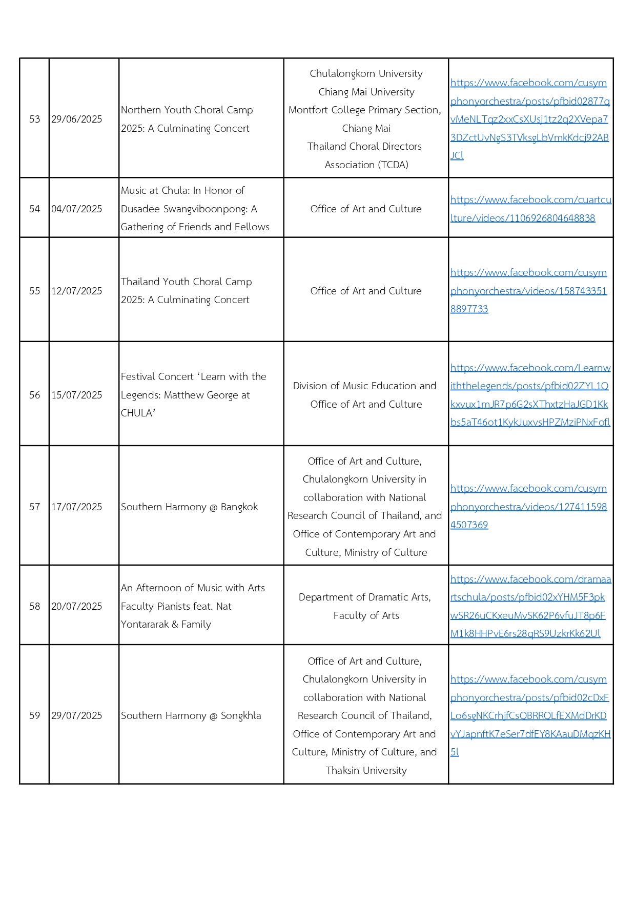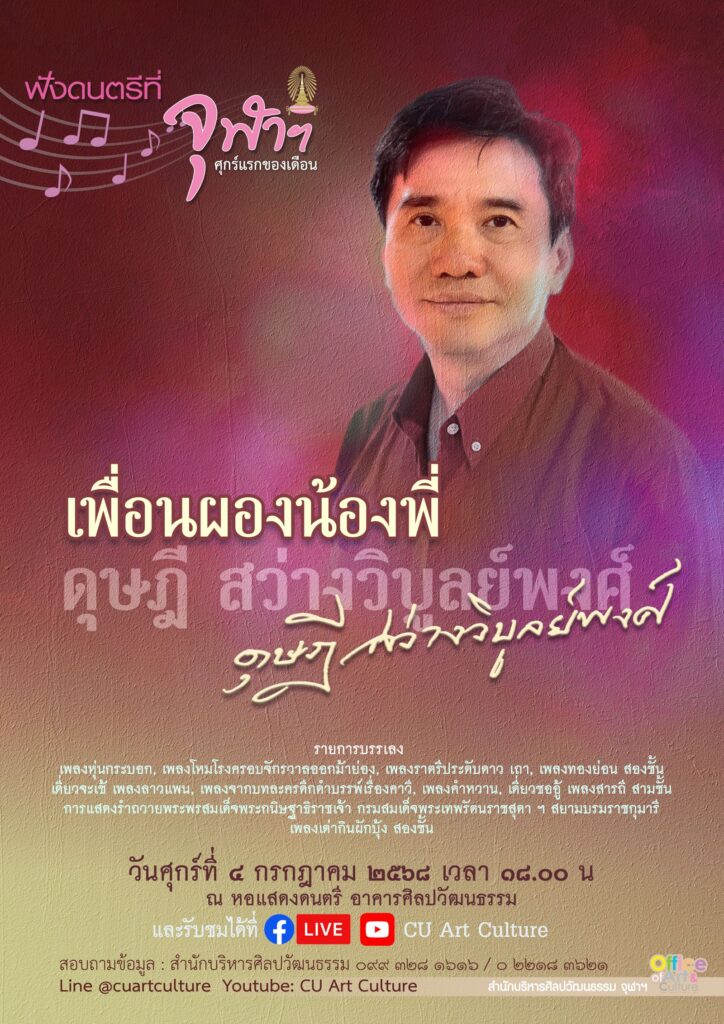 3. รายการฟังดนตรีที่จุฬาฯ ทุกศุกร์แรกของเดือน ปีละ 12 ครั้ง จัดการแสดงต่อเนื่องมากว่า 30 ปี โดยแบ่งเป็นการแสดงของวงดนตรีไทย 6 ครั้ง และวงดนตรีร่วมสมัยหรือไทยประยุกต์ อีก 6 ครั้ง