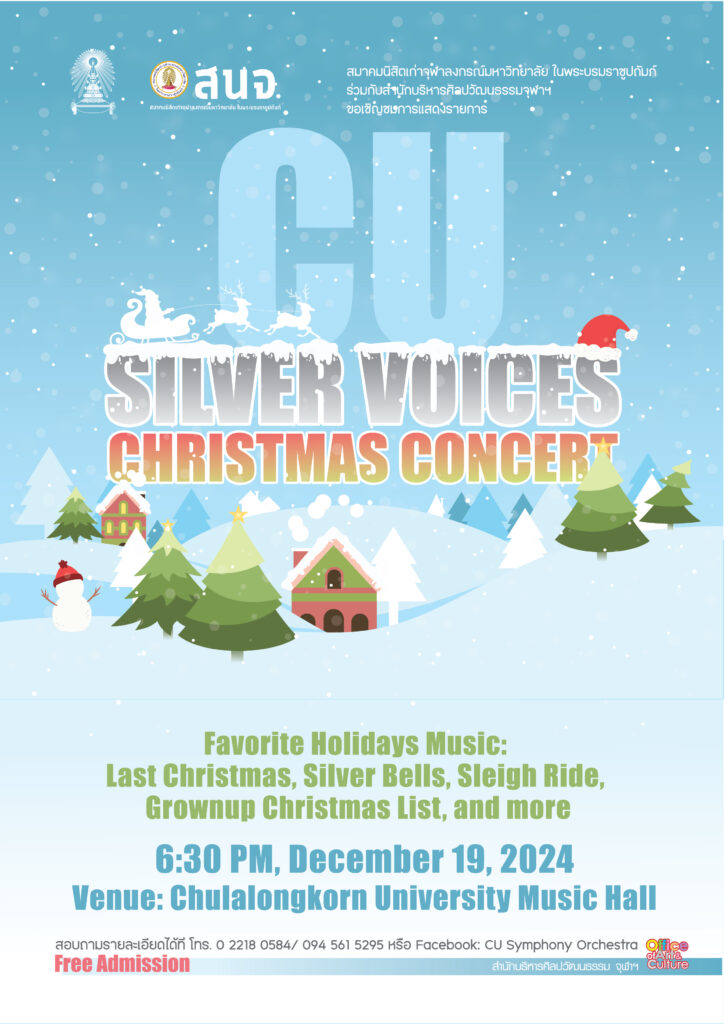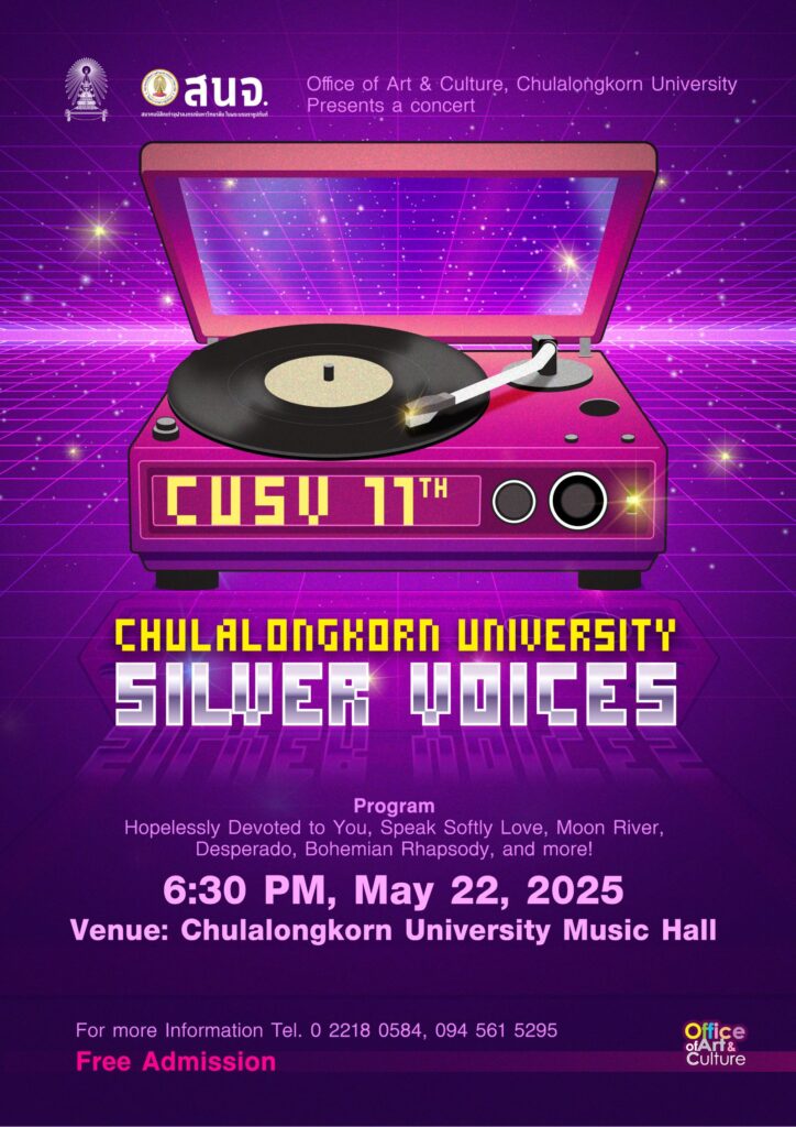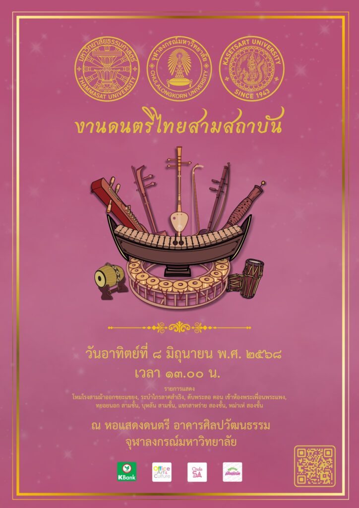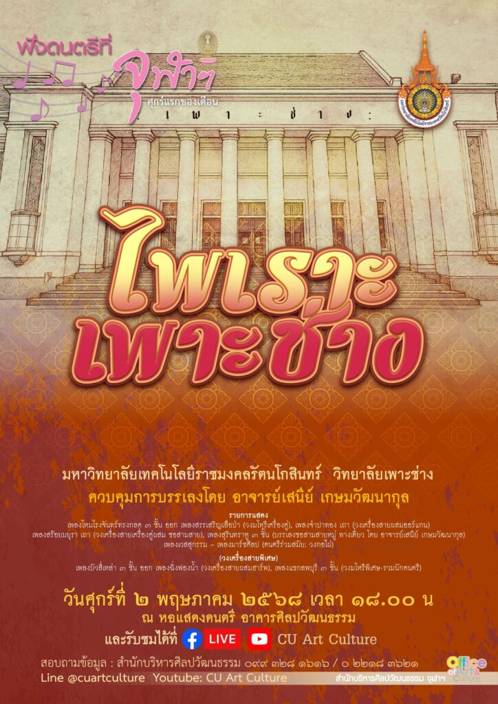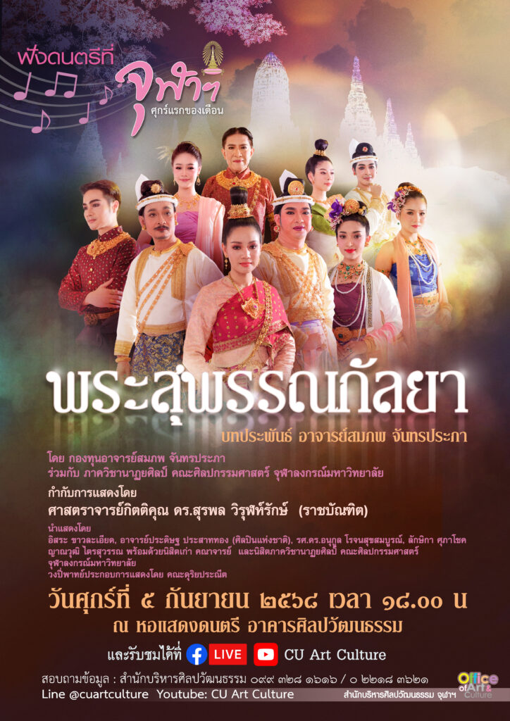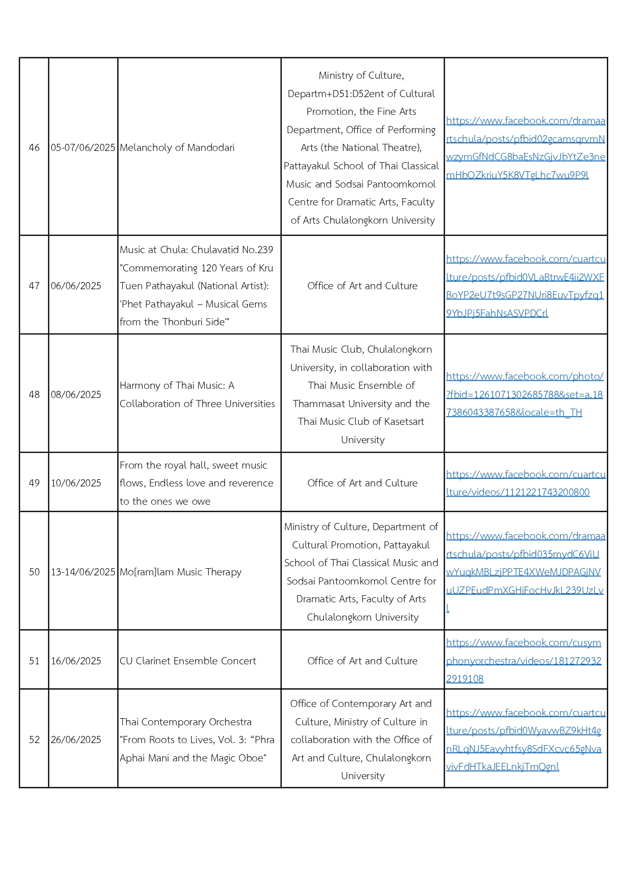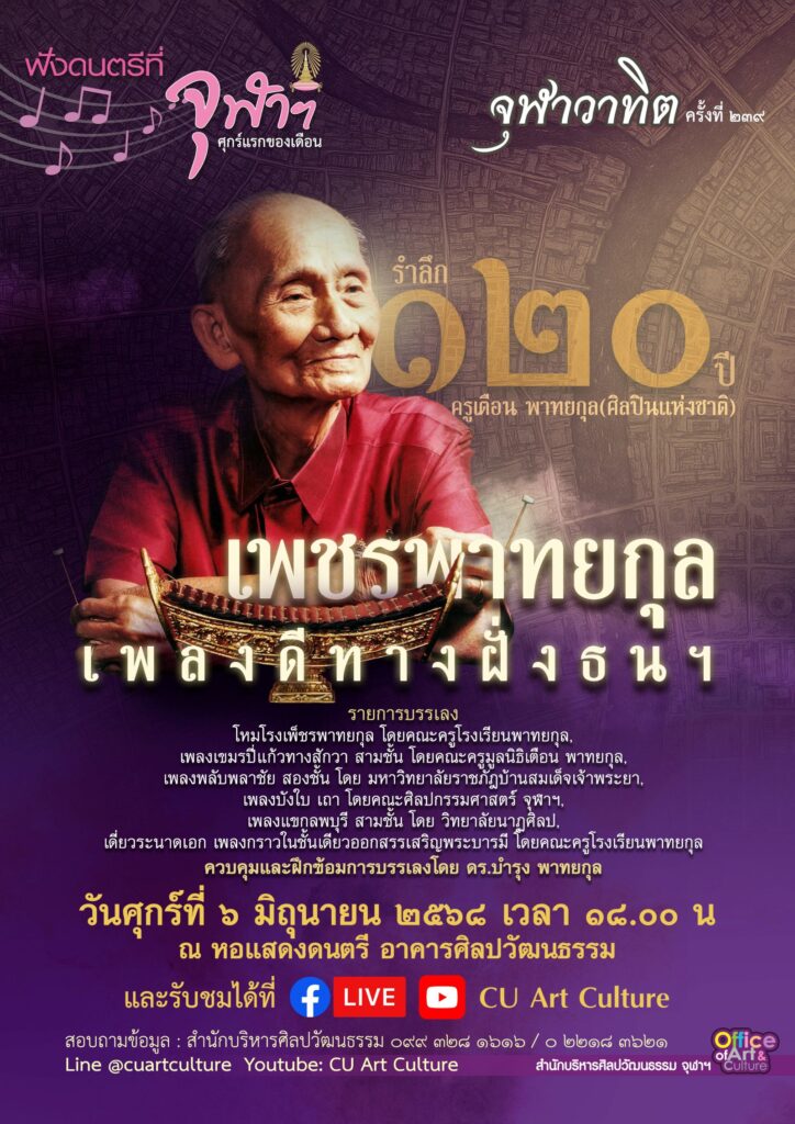 3. รายการฟังดนตรีที่จุฬาฯ ทุกศุกร์แรกของเดือน ปีละ 12 ครั้ง จัดการแสดงต่อเนื่องมากว่า 30 ปี โดยแบ่งเป็นการแสดงของวงดนตรีไทย 6 ครั้ง และวงดนตรีร่วมสมัยหรือไทยประยุกต์ อีก 6 ครั้ง