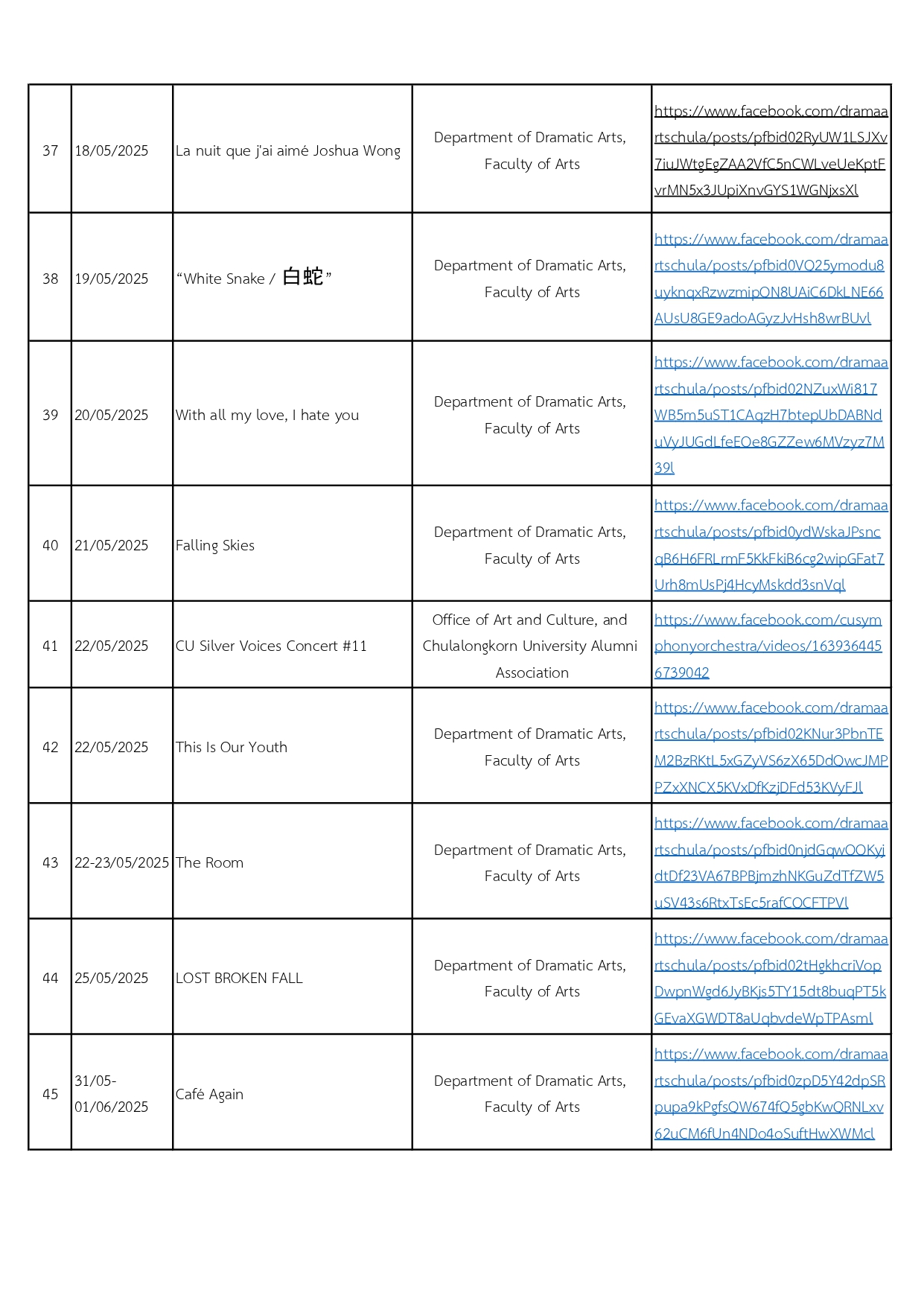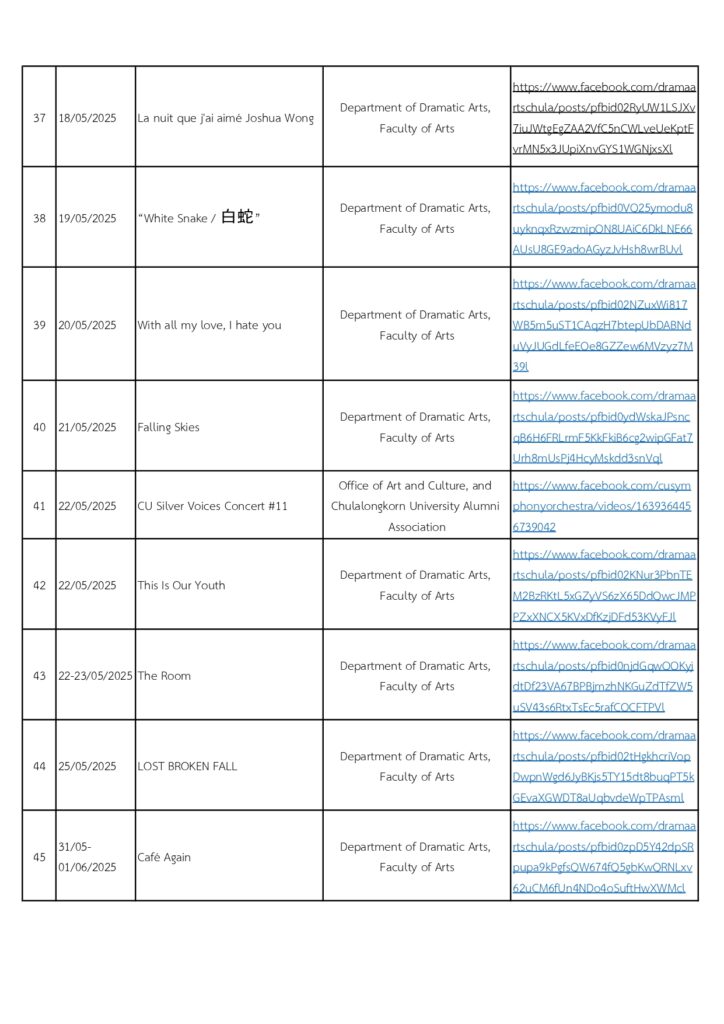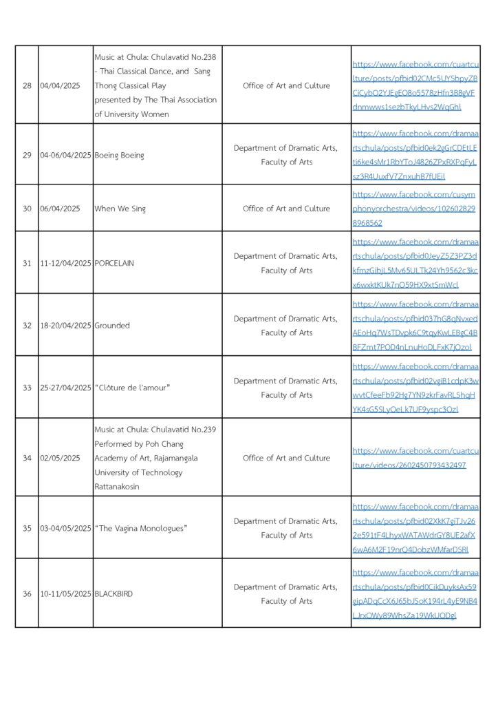 ทุกปี คณะนิเทศศาสตร์ และคณะสถาปัตยกรรมศาสตร์ จะจัดการแสดงละครเวทีของแต่ละคณะขึ้นอย่างน้อยปีละ 1 ครั้ง ส่วนของภาควิชาศิลปการละคร คณะอักษรศาสตร์ จัดการแสดงอยู่อย่างสม่ำเสมอ เพื่อสร้างเสริมประสบการณ์แก่นิสิต อาทิ “White Snake / 白蛇” จากบทประพันธ์สุดคลาสสิกของจีน เรื่อง “นางพญางูขาว” นำมาตีความใหม่ผ่านมุมมอง LGBTQ+ เพื่อสะท้อนแง่มุมความรักและแรงปรารถนาอย่างลึกซึ้ง, ละครเวที “ทางเทวดา” ดัดแปลงจากนวนิยายชื่อดัง ของ “แก้วเก้า” ศิลปินแห่งชาติ สาขาวรรณศิลป์ กำกับการแสดง และดัดแปลงเป็นบทละคร โดย ผู้ช่วยศาสตราจารย์ ดร.สาวิตา ดิถียนต์, Boeing-Boeing ละครเวทีตลกจำอวด (Farce) ระดับโลก ที่เคยคว้ารางวัลโทนี่อวอร์ดมาแล้ว เป็นต้น