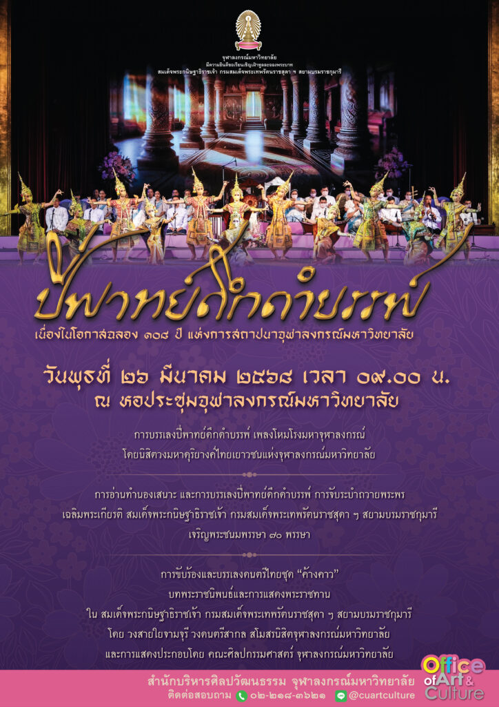 1. “ปี่พาทย์ดึกดำบรรพ์” เป็นการแสดงดนตรีและนาฏศิลป์ไทยขั้นสูง ซึ่งจุฬาลงกรณ์มหาวิทยาลัยสืบทอดและพัฒนาให้คงอยู่สืบไป โดยมีการเรียนการสอนในหลักสูตรของนิสิตทางดนตรีไทยและจัดแสดงปีละ 1 ครั้ง ในโอกาสวันคล้ายวันสถาปนามหาวิทยาลัย โดยจัดแสดงครั้งแรกในปี พ.ศ. 2530 และต่อเนื่องมากกว่า 30 ปี จนถึงปัจจุบัน