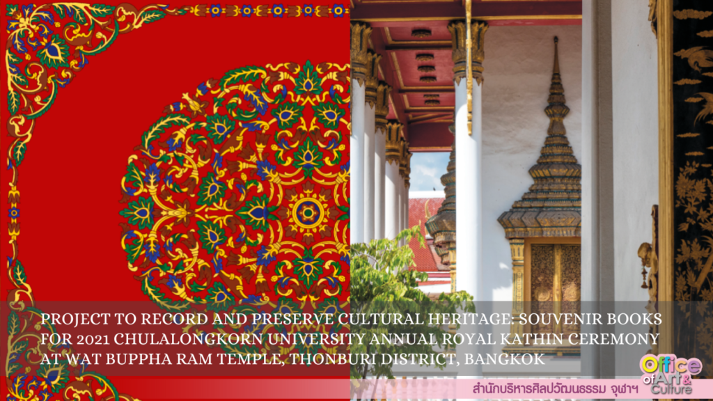 Chulalongkorn University Office of Art and Culture regularly carries out projects to record and preserve the nation’s cultural heritage. One of the projects in 2021 was a collaboration with academic departments and offices in the university in the annual Royal Kathin Ceremony at Wat Buppha Ram temple, Thonburi District, Bangkok. The ancient temple was built in the Ayutthaya Period (1351-1767) and undergone a major restoration during the reign of King Mongkut (Rama IV, 1851-1868) and extensive smaller restorations since.