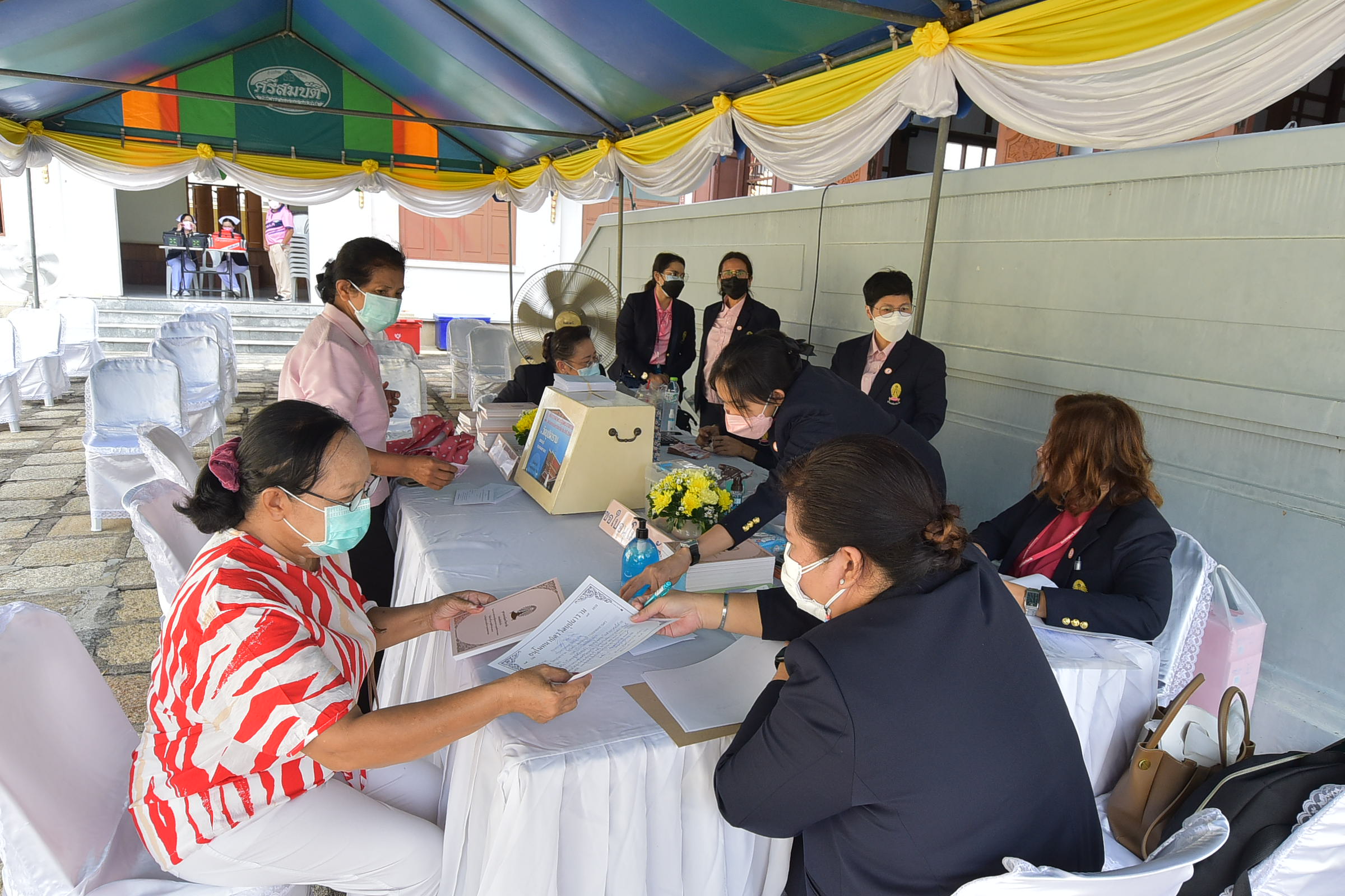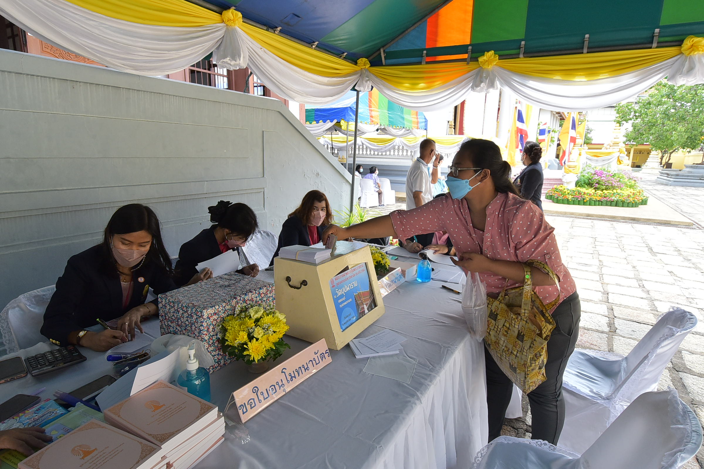 The Royal Kathin Ceremony is the most important religious ceremony organized annually by Chulalongkorn University after the end of Buddhist Lent (a period of lunar months, usually in the months of July to October), in which all high-ranking university administrators partake. The ceremony is a monetary merit-making and religious gift-giving event, in which donation money is given to the temple for maintenance, and monks are given gifts of new saffron robes and other items necessary for their monastery lives. This year in particular, part of the donation money was also designated for Buppha Ram Dhamma School. In the university’s Royal Kathin Ceremony, royal robes are given by the King through the university to pass on to the monks in a selected temple of the year, and donation money for merit-making is given by people in the university community.