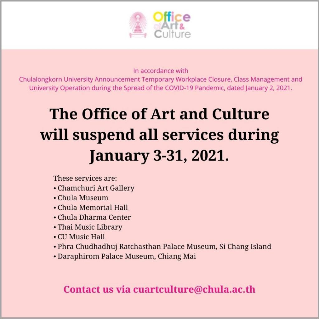 In accordance with Chulalongkorn University Announcement Temporary Workplace Closure, Class Management and University Operation during the Spread of the COVID-19 Pandemic, dated January 2, 2021, the Office of Art and Culture will suspend all services during January 3-31, 2021.