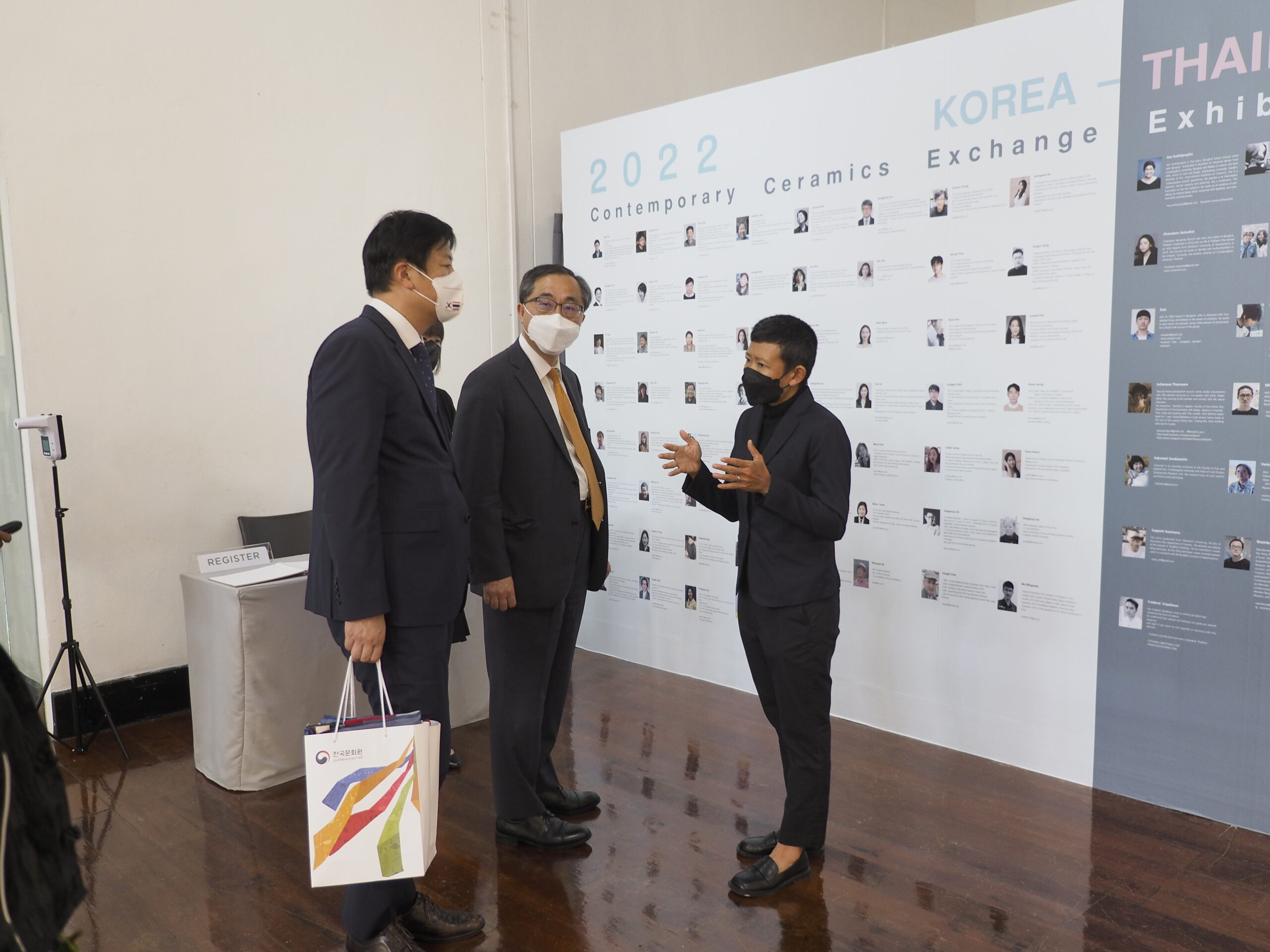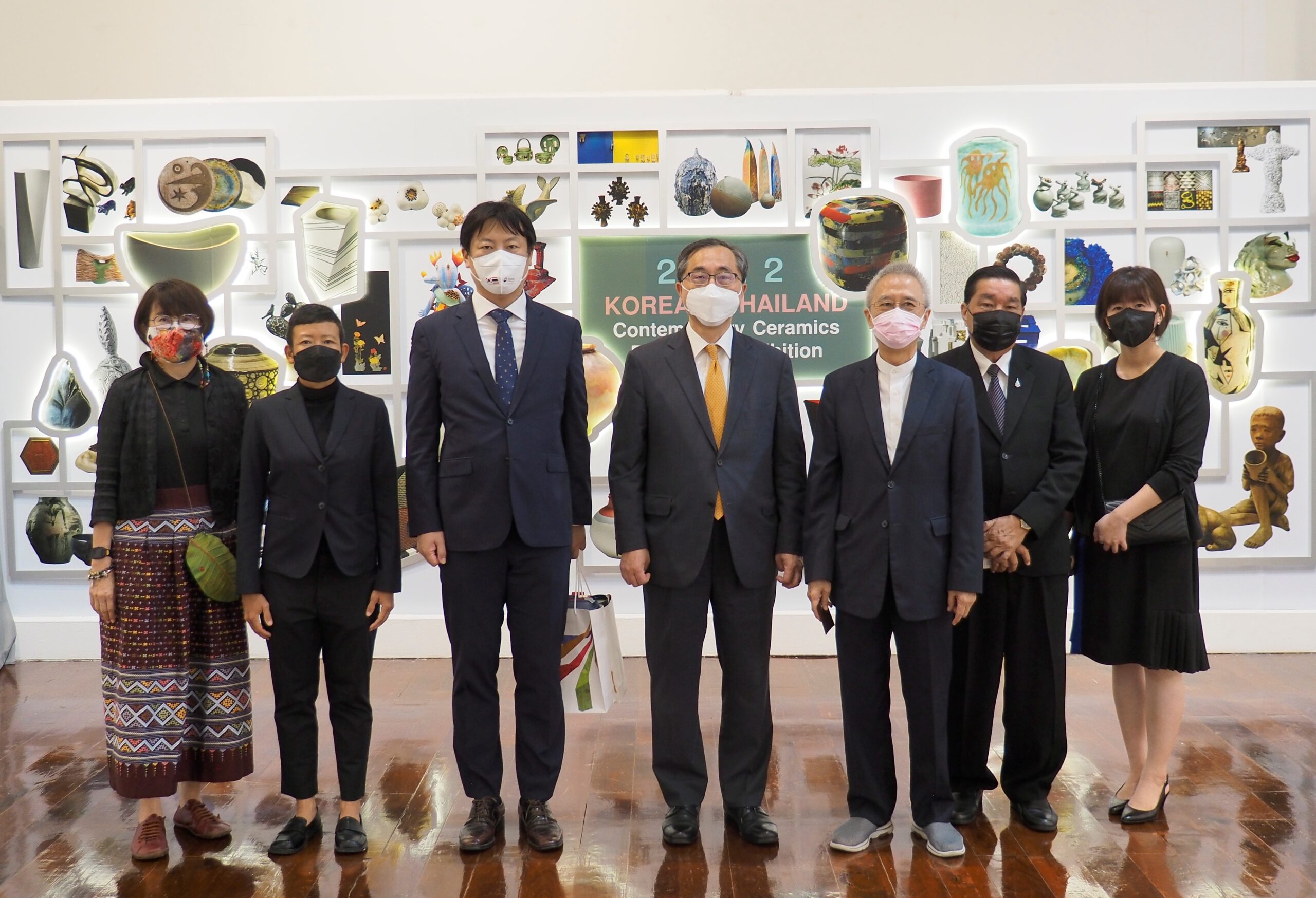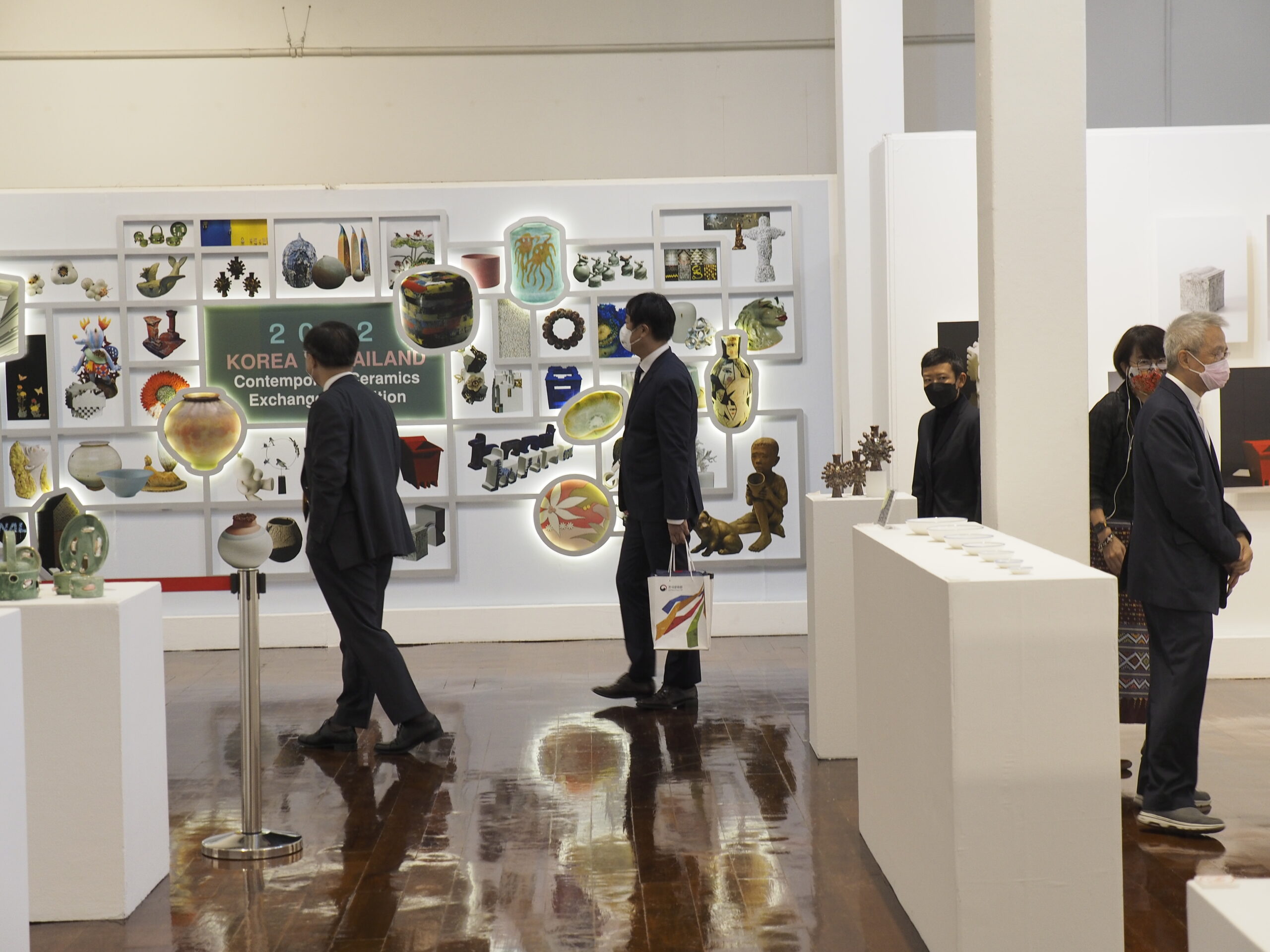 ช่วงบ่ายวันที่ 9 มิถุนายน 2565 ฯพณฯนายมุน ซึง ฮยอน เอกอัครราชทูตสาธารณรัฐเกาหลีประจำประเทศไทย นายโจ แจ อิล ผู้อำนวยการศูนย์วัฒนธรรมเกาหลีประจำประเทศไทย นางสาวซน จูยอง ผู้จัดการฝ่ายกิจกรรม ศูนย์วัฒนธรรมเกาหลีประจำประเทศไทย และนางสาวธันยากานต์ หิรัญสิทธิทวีกุล ผู้จัดการทั่วไป ศูนย์วัฒนธรรมเกาหลีประจำประเทศไทย เข้าเยี่ยมชมนิทรรศการเซรามิกร่วมสมัยไทย-เกาหลี 2022 (“2022 Korea-Thailand Contemporary Ceramics Exchange Exhibition”) ณ นิทรรศสถาน อาคารศิลปวัฒนธรรม จุฬาลงกรณ์มหาวิทยาลัย โดยมีรองศาสตราจารย์ ดร.สันติ ฉันทวิลาสวงศ์ ที่ปรึกษาอธิการบดี อาจารย์จรรมนง แสงวิเชียร ผู้เชี่ยวชาญด้านศิลปวัฒนธรรม รองศาสตราจารย์ กุลธิดา เตชวรสินสกุล หัวหน้าภาควิชาการออกแบบอุตสาหกรรม ผู้ช่วยศาสตราจารย์ พิม สุทธิคำ ศิลปินและอาจารย์ประจำภาคภาควิชาการออกแบบอุตสาหกรรม คณะสถาปัตยกรรมศาสตร์ จุฬาลงกรณ์มหาวิทยาลัย และหรรษา คำล้วน ผู้อำนวยการฝ่ายพิพิธภัณฑ์และหอศิลป์ ให้การต้อนรับและนำชมนิทรรศการ