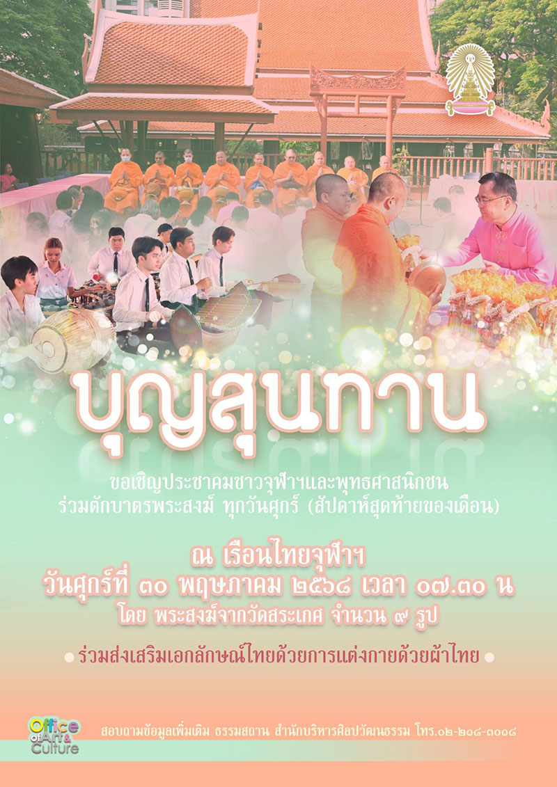 ขอเชิญพุทธศาสนิกชนทุกท่านเข้าร่วมกิจกรรมตักบาตร ณ เรือนไทย จุฬาฯ (ทุกศุกร์สุดท้ายของเดือน)